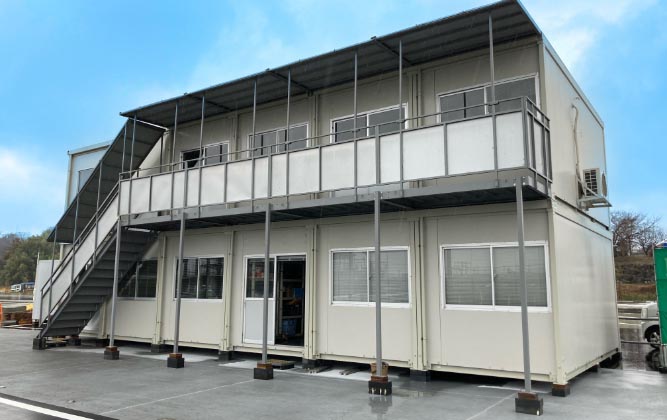 ユニットハウスは、コンパクトな1坪タイプからフレキシブルに拡張可能な連棟タイプ、2階建てまで多種多様にご⽤意しています。また、事務⽤品やOA機器、家電製品といったオフィスに必要な備品類も多数ラインナップ。お客さまの快適な仕事環境の実現に向けて、オールインワンでお⼿伝いをさせていただきます。